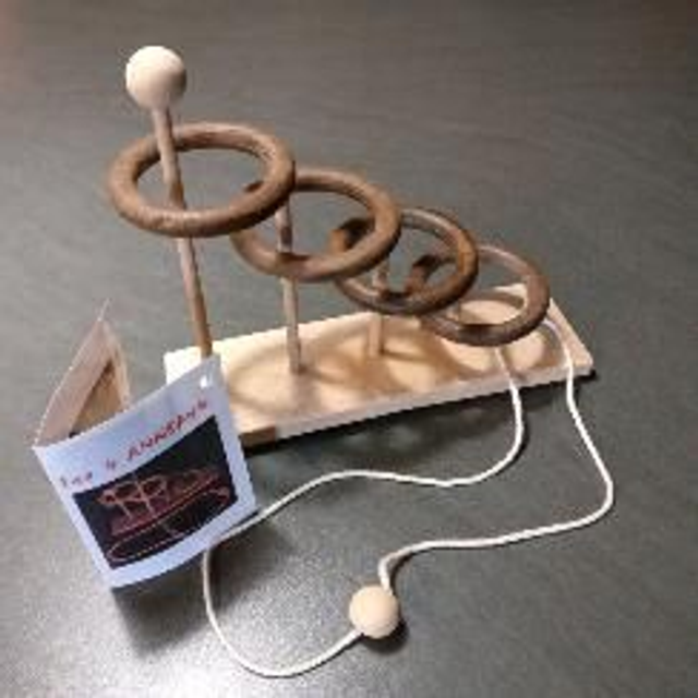 Le but de ce casse-tête consiste à extraire la ficelle de l'ensemble des anneaux. Fabriqué artisanalement dans mon atelier à partir de matériaux recyclés, ce jeu de réflexion et de manipulation est d'un niveau de difficulté élevé. A partir de 10 ans.